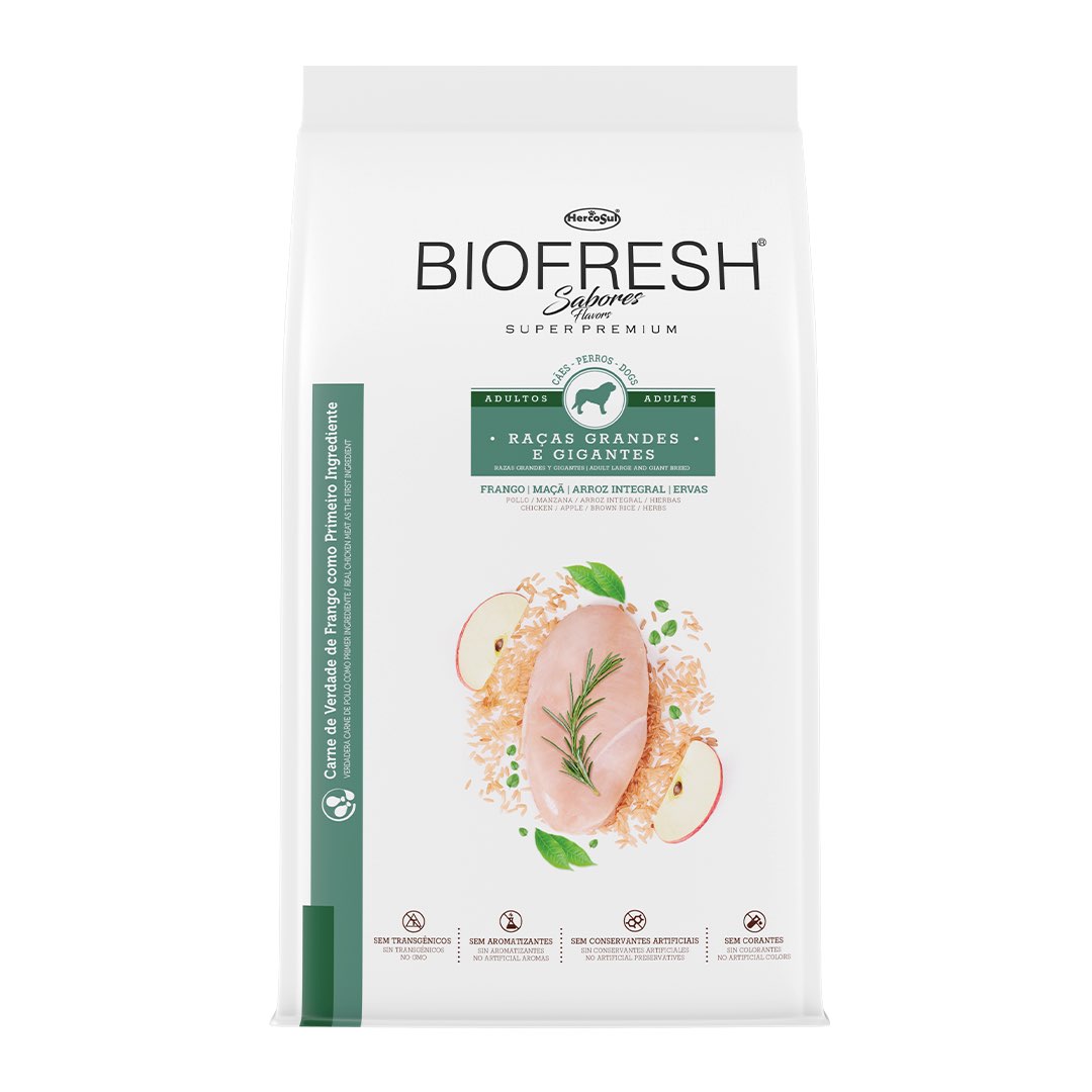 Biofresh Super Premium é inovador e diferente porque possui alta inclusão de ingredientes frescos, diretamente da natureza l O resultado é um alimento completo e equilibrado que se destaca por elevar a nutrição dos cães de raças grandes e gigantes ao seu mais alto patamar l A TECNOLOGIA Biofresh garante a preservação deste alimento de forma segura e 100% natural, SEM ADIÇÃO DE CONSERVANTES ARTIFICIAIS.