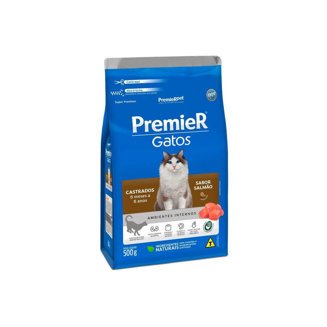 RAÇÃO PREMIER GATOS CASTRADOS 6 MESES A 6 ANOS SALMÃO Tamanho:500G