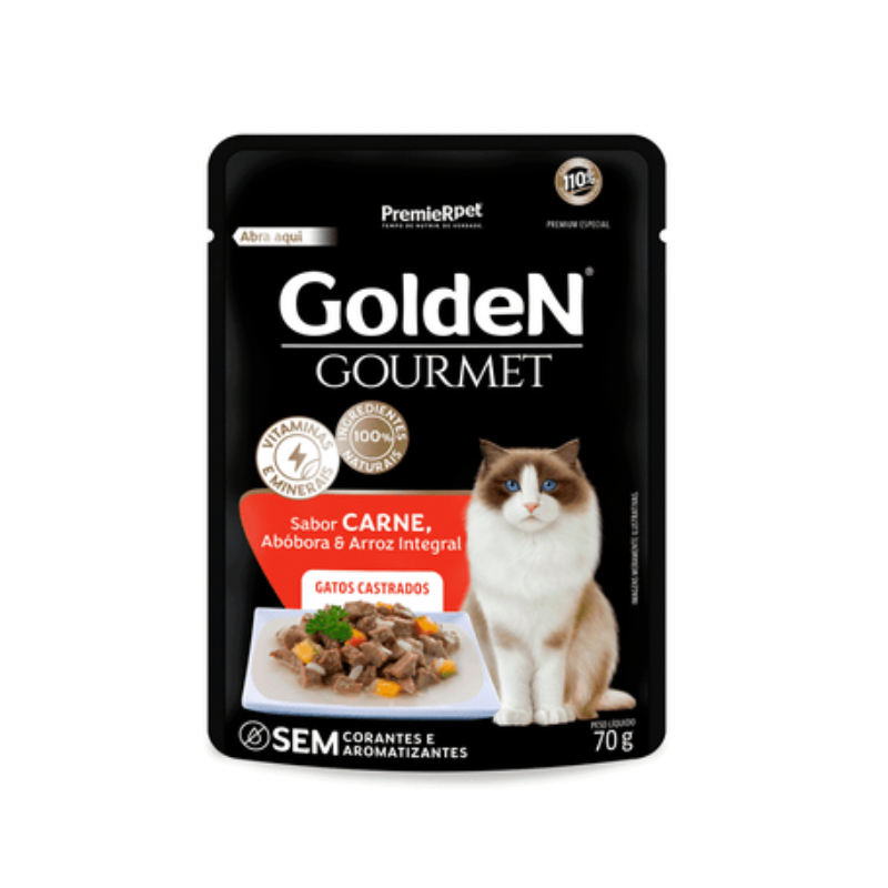 RAÇÃO ÚMIDA SACHÊ GOLDEN GOURMET GATOS CASTRADOS CARNE 70g